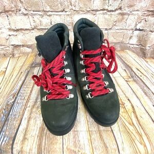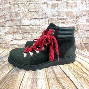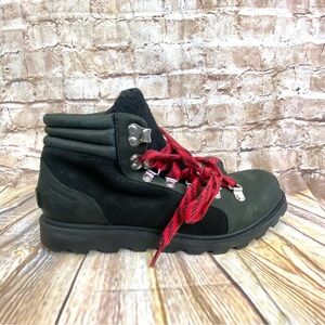 SOREL Ainsley Conquest Waterproof Leather Ankle Hiking Boots Black Size 8 - Features: * suede and full grain leather combination * waterproof construction * fastened with flat laces looped through D-ring eyelets and hooks * padded collar for comfort * molded rubber outsole offers effective traction * removable cushioned footbed * round toe Black, red laces Fabric: Suede and full grain leather combination upper
