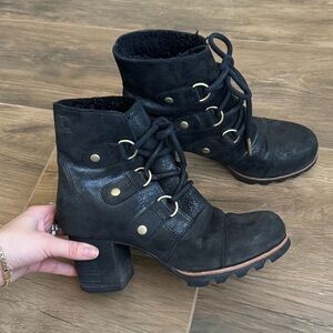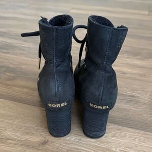 Quality construction and materials for weathering any adventure pair with stylish silhouettes and details in Sorel's practical-with-a-twist boots. Tie closure. Waterproof leather upper, unlined. Removable molded footbed with heel cup and arch support, synthetic topcover. Molded rubber midsole, sole. Leather wrapped heel for extra support. Size 7. In good preloved condition, please see all photos for details of wear