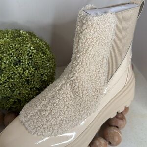 Patent leather and faux shearling upper
