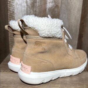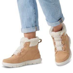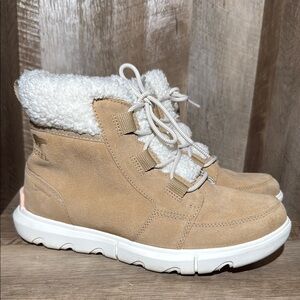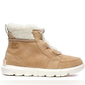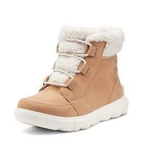 Experience warmth and style with Sorel's winter and rain boots, featuring a tan suede upper and a cozy sherpa collar. The chunky white sole provides comfort and support, making these boots perfect for cold weather adventures.