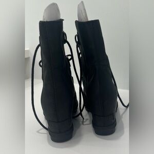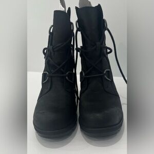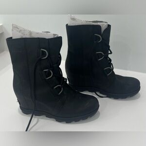 SOREL JOAN OF ARCTIC WEDGE II black lace-up boots have a full-grain leather upper with rubber soles to provide grip. Advertised heel height is 3 inches. Includes original box. Shows light wear.