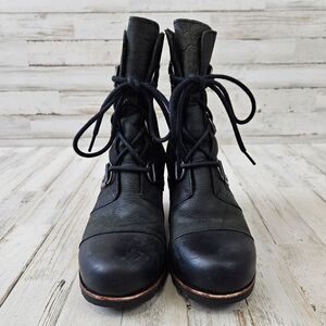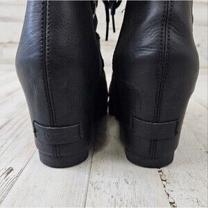 These womens size 9 wedge black lace up boots deliver height and comfort. Good pre-loved condition.