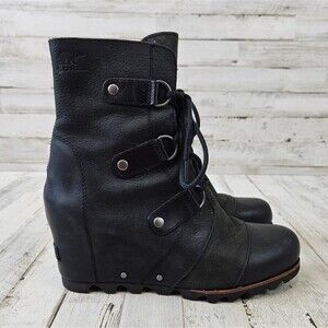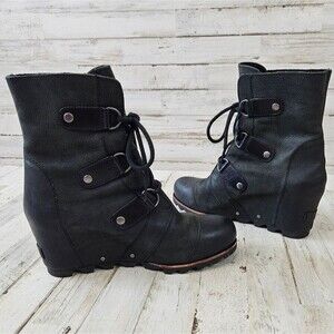 SOREL Joan Of Arctic Leather Wedge Mid Winter Ankle Boots in Black NL1987
