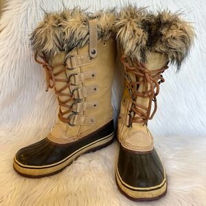 SOREL Joan of Arctic Leather Faux Fur Waterproof Winter Boots, Taffy/Port Royale