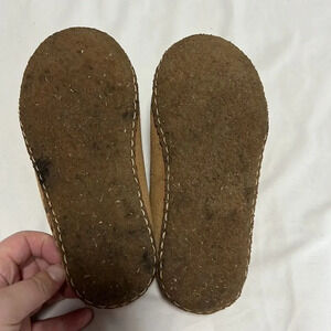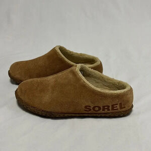 Beautiful Sorel slippers in light brown suede, and on the side it says "Sorel" in brown letters embossed into the leather.