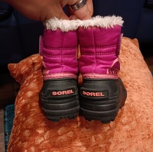 Sorel winter boots in pink and black. Features a cozy fur lining.
