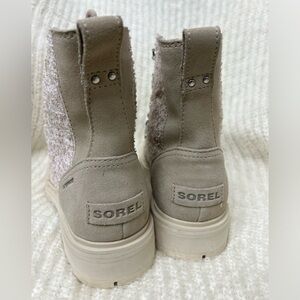 SOREL fashion & comfort water proof boots in suede w/textile & shearling tongue for all day wear. Rubber sole. Pre owned condition with very little wear like new.