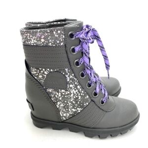 Sorel Lexie Leather Wedge Lace up Boots Metallic Silver Gray Style 182247105