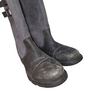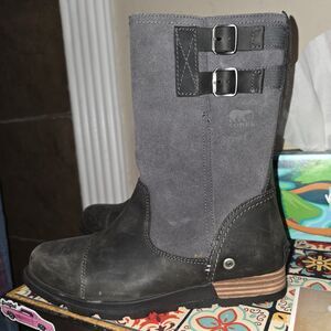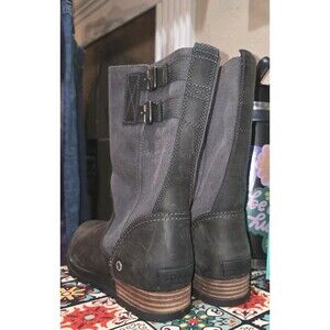 SOREL MAJOR Sz 8.5 Gray Distressed Leather Pull On Side Buckles Logo Midi Boots