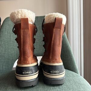 Durable Sorel boots with brown leather and black rubber. Cozy cream lining for warmth.