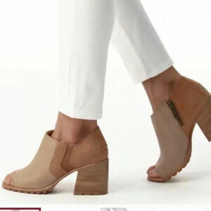 SOREL NADIA ANKLE BOOTIES Leather upper with peep toe for flirty charm Leather lining Inside zip for easy on-off EVA cushioned footbed Leather-wrapped stack block heel Color: HONEST BEIGE SIZE : 9