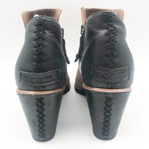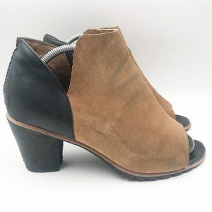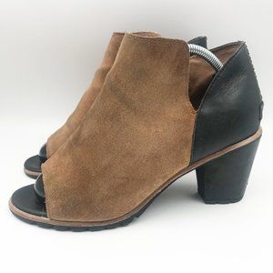 SOREL Nadia Peep Toe Suede Tan Black Block Heeled Ankle Booties Womens 8.5