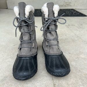 SOREL OUT N ABOUT PLUS TALL WOMEN'S QUARRY/COAL outdoor duck boots. Handcrafted herringbone sole for non-slip traction. Boot shaft measures approximately 9 inches in height. Micro fleece lining. See sealed waterproof construction. Excellent condition with minimal. Women’s size 7.5.