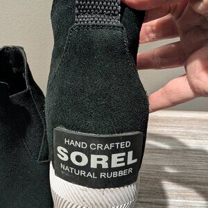 Material: Suede Upper with Textile lining and Rubber sole. The heel prominently notes "Hand Crafted SOREL Natural Rubber."