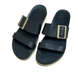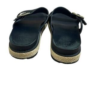 SOREL ROAMING BUCKLE SLIDE JUTE BLACK SIZE 9 Sorel Women's Roaming Black Leather Platform Espadrille Sandal in size 9. Slip on. Adjustable buckle strap. Pre-owned good condition.