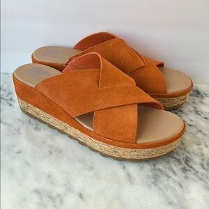 Step into comfort with Sorel's orange suede slide sandals. Perfect for casual outings, these sandals offer both style and ease.