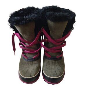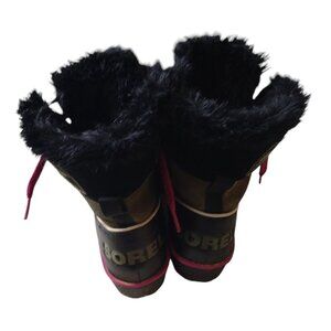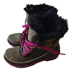 Women's size 5.5 Sorel Trivoli II winter boots are green suede and black with pink trim and laces. They have logo on the side and on the heel.