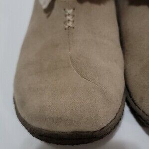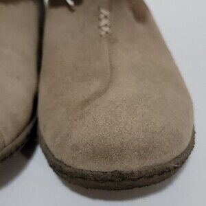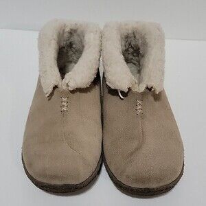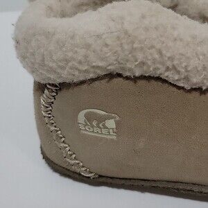 Pre-owned Sorel Valle Bleue tan fleece lined bootie slippers size 5. Soft fleece lined slippers with rubber sole. Some signs of wear/discoloration by toe area and bottoms. Please see photos.