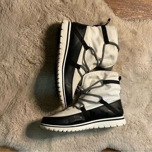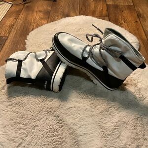 SOREL Winter Boots Womens Size 10.5 Sea Salt Cozy Explorer Non Shell Lined Lace, some spots on the white light, good used condition
