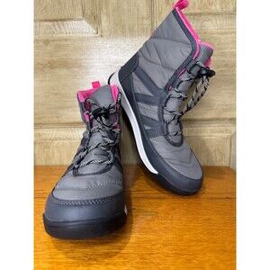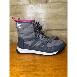 These are SOREL Whitney II snow boots for women in size 6. They are gray winter boots with a lace-up closure, featuring a round toe and ankle shaft style. The boots are waterproof, designed for outdoor activities in winter, fall, and spring. They have a low heel height and are made of nylon material. The brand is Sorel, and the model is Whitney II. The boots are suitable for various occasions such as travel, activewear, casual wear, and workwear.
