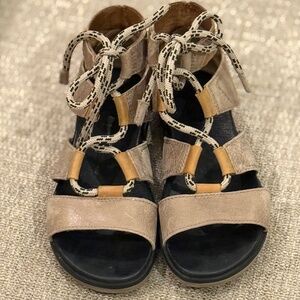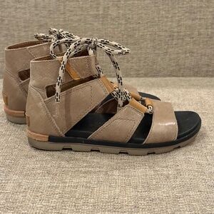 Iconic Sorel leather sandals with rope laces and comfortable cushion soles. Very lightly worn. Light tan with black soles. A great way to wear an ankle-wrap sandal with soft leather and supportive soles.