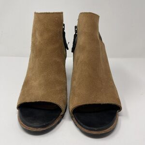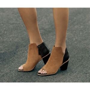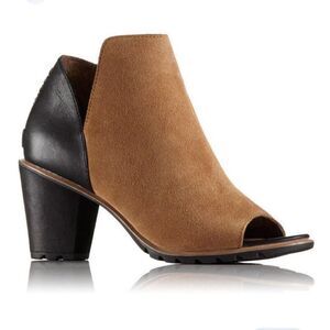 SOREL Nadia Leather Camel Tan and Black Peep Toe Booties Women’s Sz 9.5 BoxD
