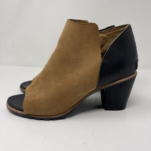 SOREL Nadia Leather Camel Tan and Black Peep Toe Booties Women’s Sz 10 Nl2843. Preloved conditions has some wear/ rough scratched areas on the heels please see pictures as it is hard to discribe. Heel height 3".