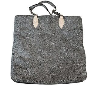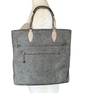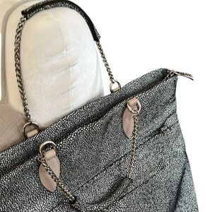SORIAL Black and White Pebbled/ Dot Shimmer Chain Link Hand Bag. Featuring a unique black and white leather exterior, outside zip pocket, interior zip pocket, two open pockets inside, a top zip closure, chain link and leather top handle.