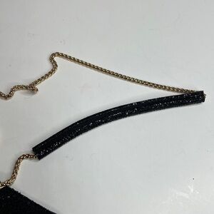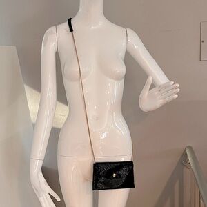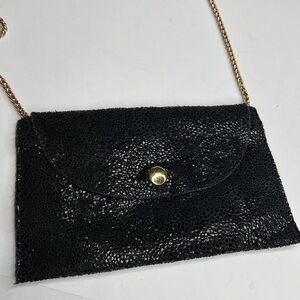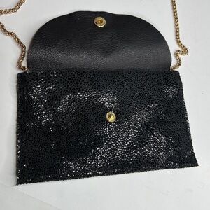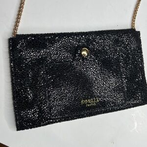 This is a beautiful SORIAL New York Black Glossed Pebbled Leather Mini Crossbody Bag. Shoulder protector with gold rounded chain. Snap closure. Outer snap id compartment. No odors. No stains.