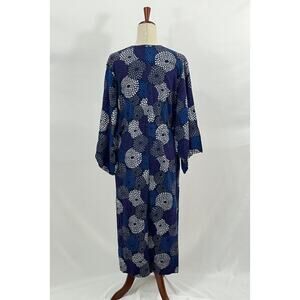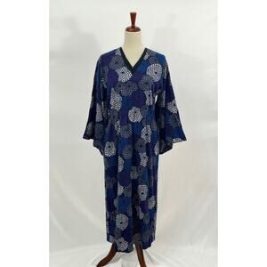 Women's dress by SOU SOU. Size M Medium. 100% cotton. Kimono sleeve. Blue, purple, gray, white floral. Kimono style sleeve. V-neck, fabric has a gauzy feel, maxi length, elastic waist, pockets Good condition, no stains, holes or pilling. Minor fade