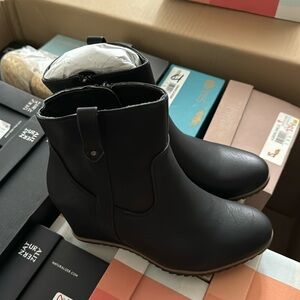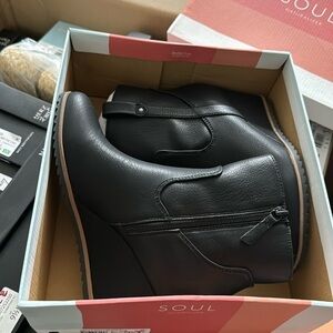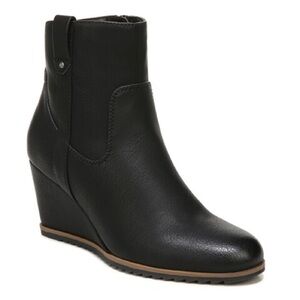 A westernized version of the ankle bootie you know and love. Lifted on a wedge and grounded on a sawtooth outsole, you'll love every detail of this style from SOUL Naturalizer. Inspired by the way you live. Western-inspired ankle bootie with wedge heel. Faux nubuck or faux leather upper with a closed almond toe and stitched details. Side zip closure and side pull tab. All-Thru Comfort: soft foam lining, arch support with memory foam, sock lining, lightweight and flexible outsole. Consciously packaged: 100% of our shoe boxes are made of 80% recycled paper + soy-based ink. WHY YOU'LL LOVE IT: Ingenious relaxed utility. Unstructured, uncomplicated styles thoughtfully designed with your comfort in mind so you can live in the moment.