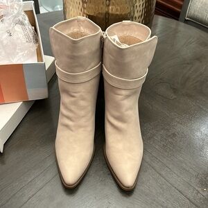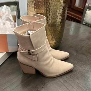 Comfy western-inspired ankle bootie with pointed toe, manmade upper, side zip closure and stylish wraparound straps