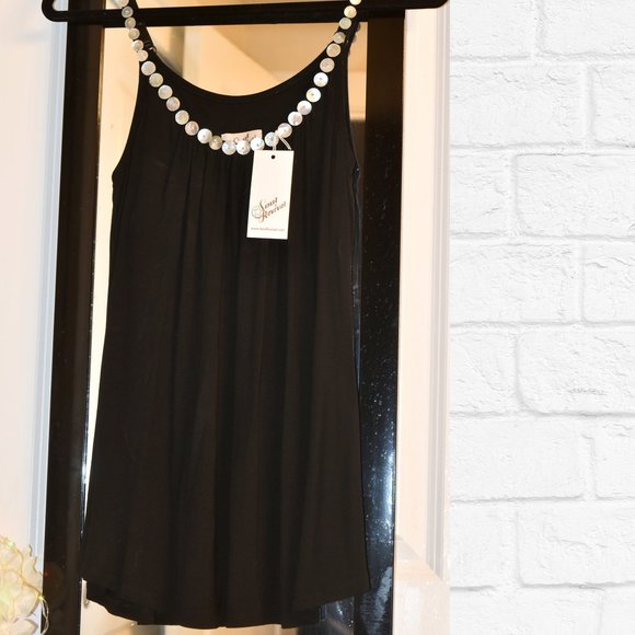 Tank top embellished with small shells on the neckline. This is an easy flowing tank top that can accommodate all sizes. Size M. Chest Neckline. Adjustable shoulder straps and a grecian fit. Unlined built-in shelf bra.