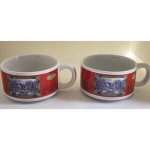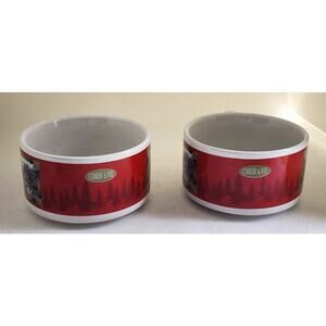 Nice set of soup bowls by Houston Harvest Gift Products. The theme is a Currier & Ives design. The outside is red with shadow evergreen trees. The same image is on both sides. It is a vintage winter scene of people skating on a frozen lake. The image is done in black & white. There is one handle on the bowl. This is a set of 2 bowls.