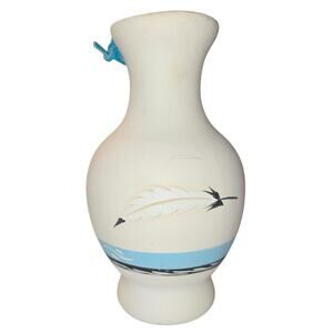 This beautiful Southwest American Indian pottery vase is hand-painted with a delicate feather design. The baby blue color is soft and serene, and the vase is signed by the artist, adding to its unique value. Measuring 7.5" tall, it's the perfect size for displaying flowers or as a standalone decorative piece. This vase will add a touch of Southwestern charm to any home.