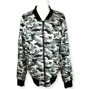 SOVEREIGN CODES CAMO BOMBER JACKET SZ.L EUC. Black, gray, & white. In excellent used condition.
