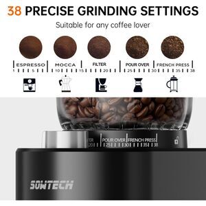 SOWTECH Anti-static Conical Burr Coffee Grinder, Adjustable Burr Mill with 38 Precise Grind Setting, precision timer, for EspressoDripPour OverCold BrewFrench Press Coffee Maker(Black)