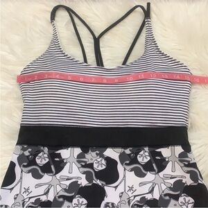 Stylish Sobyu black and white mixed print exercise dress with stripes and floral pattern.