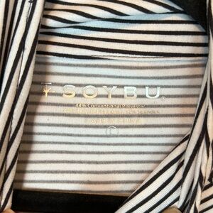 Here is a fun SOYBU | Striped Athletic Pullover 3/4 Zip Workout Long Sleeve Top Size L in good used condition with a few light spots as shown. Measurements are approximately 26 inch length, 31 inch sleeves and 19 inch width from pit to pit when flat .