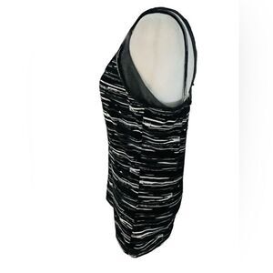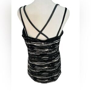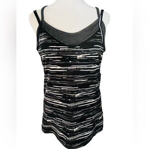 SOYBU tank top with attached crop bra underneath, criss cross straps size L. Black, white and gray tank top with criss cross straps in back, with attached gray crop sports bra underneath. Polyester and spandex blend.