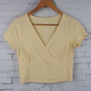 YELLOW SHORT V NECK MOCK WRAP CROPPED TOP SIZE MEDIUM BY SO PRE OWNED NO FLAWS