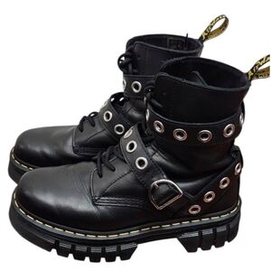 DETAILS The Audrick hits ear-splitting levels. Our two-part Quad Neoteric sole returns with amped-up silver hardware, XL eyelets with branded D-ring buckles — inspired by decades of DMs customization. The Quad Neoteric is a radical rework of our stacked Quad sole, with a two-part lightweight construction, deep cleats and an exaggerated side profile. A towering platform you can wear every day. Built from black Nappa Lux leather and detailed with blind eyelets and cord laces, these boots are fitted with a SoftWair comfort insole and padded spacer mesh tongues for added comfort. They come marked by our classic yellow stitching and heel loop. Lightweight platform sole Nappa Lux is a classic nappa leather — soft and smooth to the touch Our SoftWair memory foam footbed ensures comfort from the first step Our Goodyear-welted lines are heat-sealed at 700°C and reinforced with our signature welt stitch Platform height: 1 1/2 in; Heel height: 1 7/8 in Nappa Lux - a classic nappa leather — soft and smooth to the touch.