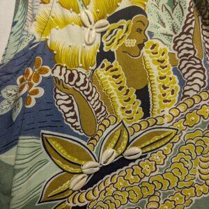 This unique, sleeveless top has 3 buttons and a stylish tie waist. It is a picturesque print of a beautiful island girl with tropical surroundings and real seashell embellishments. This top would be perfect for a tropical vacation or a cruise!