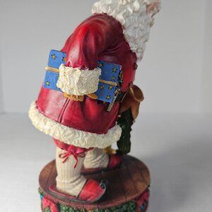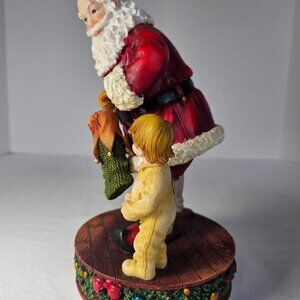 A beautiful vintage resin musical Christmas Santa Claus with Tony ( child's name), figuring. It has beautiful detailing. The round base is simulated to look like a wood floor, and the facade of the base has a raised design of thick holly leaves with pretty red holiday bows and ornaments that have a metallic sheen to them. The Old World Santa has glittering cuffs and trim on his jacket. Adorable knit knickers socks with red bows and elf like curled toe slippers. Tucked under his right arm is a wrap gift with the tag labeled Tony, and his other hand he's holding a green stocking with the name Tony on it. Apparently little Tony woke to find Santa Claus when he was getting ready to put his gifts in Tony's stocking. An adorable figurine scene and it plays. We wish you a merry Christmas, when you wind the turn key on the base. Works great. The figurine is in mint condition. Measures: 8 1/4 inches tall base is 4 3/8 inches. Non smoking pet free home. @ ER NW Boxed
