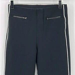 SPANX Ankle Piped Skinny Perfect Pants in Classic Black - Size Medium. Excellent pre-owned condition. With flattering details and all the comfort of leggings, these perfect black pants are go-tos for any outfit or occasion. Mid-weight ponté jersey. Contrast piping, Zip front pockets, faux welt back pockets. No closure, pull on design. Approximate measurements: 14 1/4" waist, 11" rise, 25 1/2" inseam.