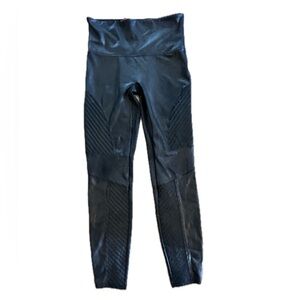 Sleek faux leather leggings. High-waisted design. Ribbed detailing on legs. Perfect for a stylish look.
