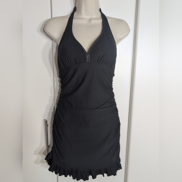 Elegant black swim dress. Halter neckline. Ruffled hem. Perfect for beach or pool.