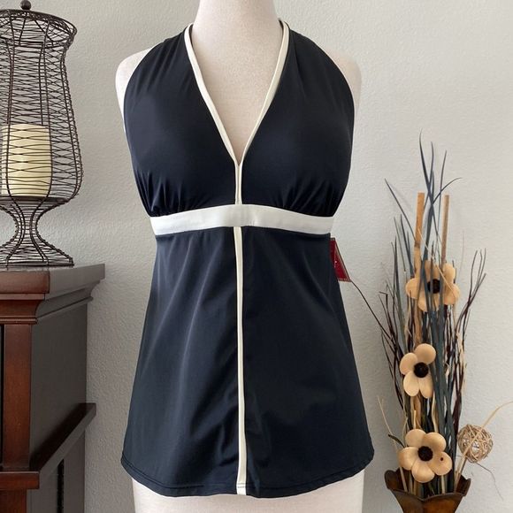 Elegant black bikini top with white trim. Halter neck design. Perfect for a stylish swim look.