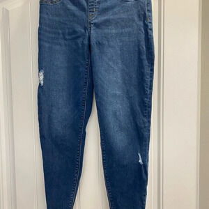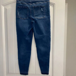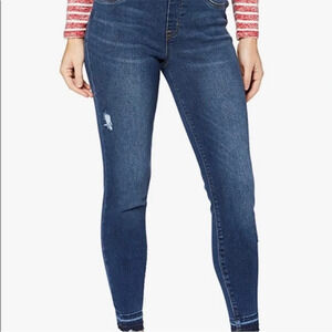 Elevate your wardrobe with these Spanx high-rise pull-on skinny jeans. The distressed and raw hem details add a touch of edge to these classic blue jeans. The elastic waist and tummy control ensure a comfortable and flattering fit for all-day wear.