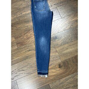 Skinny jeans with hidden tummy control panel by Spanx! In excellent condition. Factory distressed and aged with raw hem/cuffs. Faux fly and front pockets; wide waistband, rear pockets. Cotton/Lyocell/Spandex. Machine wash. Top of waist measures approx 15" across, 10.5" rise, 28" inseam.